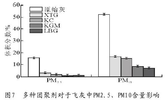 通過圖7可見,添加多種團(tuán)聚劑后,飛灰粒物中PM2.5和PM10分別都有不同程度的減少,其中團(tuán)聚劑LBG效果較顯著,團(tuán)聚劑KGM其次。