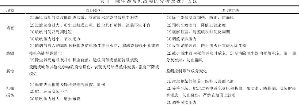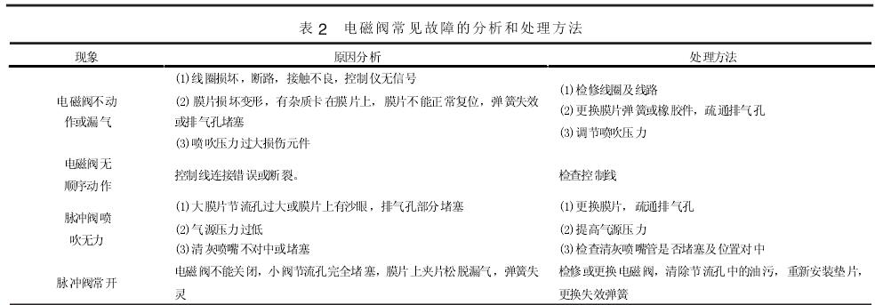 在除塵器的日常運(yùn)行中,由于運(yùn)行條件會(huì)發(fā)生某些改變,或者出現(xiàn)某些故障,都將影響設(shè)備的正常運(yùn)轉(zhuǎn)狀況和工作性能,要定期地進(jìn)行檢查和適當(dāng)?shù)恼{(diào)節(jié),降低動(dòng)力消耗及回收有用的物料。 同時(shí),特別要堵住除塵器排灰口的漏風(fēng),因?yàn)樵诔龎m器的灰斗中有大量緩慢下落的粉塵, 逆流向上的漏風(fēng)氣流又造成下落粉塵的二次飛揚(yáng)及多次循環(huán), 因而排灰口漏風(fēng)可使除塵器內(nèi)的粉塵濃度成倍地高于入口的粉塵濃度, 這樣_惡化了除塵器的工作條件,影響了除塵效率[5] 。 除塵器常見故障的分析及處理方法見表 1,電磁閥常見故障的分析和處理方法見表 2。