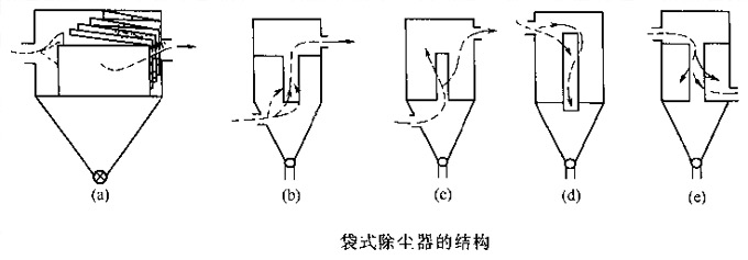 圖中(b)、(c)、(d)、(e)均為圓袋式除塵器,濾袋形狀為圓筒形,直徑一般為120~300mm,_不_過600mm;高度為2~3m,也有10m以上的。由于圓袋的支撐
