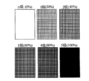 林格曼煙氣濃度圖是 19 世紀(jì)末法國(guó)的林格曼提出的。這種方法是把圖放置在適當(dāng)?shù)奈恢蒙?,使圖上的黑度與煙氣的黑度(或不透光度)相比較,憑視覺(jué)進(jìn)行評(píng)價(jià)。在工業(yè)爐窯大氣污染物排放標(biāo)準(zhǔn)中,排放限制(除非金屬焙燒爐窯外)為煙氣黑度不大于 1 級(jí)。林格曼圖有多種規(guī)格,通用標(biāo)準(zhǔn)形式是由 14c m ×21cm 的黑度不同的 6 小塊組成。除全白與全黑塊 2 外,其他 4 塊是在白色背底上畫上不同寬度的黑色條格。根據(jù)黑色條格在整修小塊中所占的面積的百分?jǐn)?shù)分成 0-5 的林格曼級(jí)數(shù): 0 級(jí)是全白, 5 級(jí)是全黑, 1 級(jí)是黑色條格占整塊面積的 20% , 2 級(jí)占 40% ,以此類推,如圖