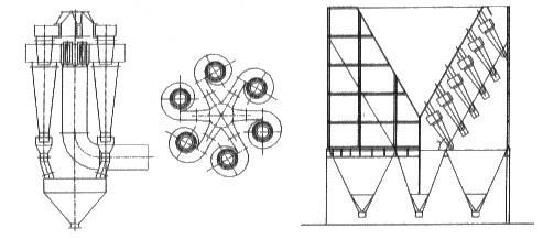 ( 2 )把傳統(tǒng)的單進口改為多進口,有效地改進旋轉(zhuǎn)流氣流偏心,同時旋風器阻力顯著下降。( 3 )在筒錐體上加排塵通道,防止到達壁面的粉塵二次返混。