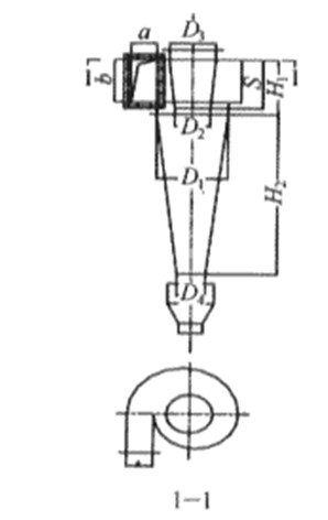 單體基本結(jié)構(gòu)參見圖 1 ,含塵氣體通過進口起旋器產(chǎn)生旋轉(zhuǎn)氣流,粉塵在離心力作用下脫離氣流和筒錐體邊壁運動,到達壁附近的粉塵在氣流的作用下進入收塵灰斗,去除了粉塵的氣體匯向軸心區(qū)域由排氣芯管排出。