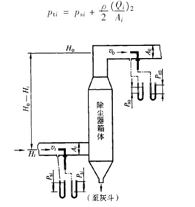 上式中,右邊_項(xiàng)是除塵器的出、入口靜壓差;_項(xiàng)是出、入口測(cè)定截面積有差別時(shí)的動(dòng)壓校正。如果假定出、入口通風(fēng)道的截面積相等,而且沒(méi)有高低差,那么,_項(xiàng)、第三項(xiàng)_不存在以上所說(shuō)的壓力損失也包括除塵器前后通風(fēng)管的壓力損失,除塵器自身的壓力損失要扣除通風(fēng)管的壓力損失.